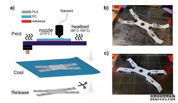 a)解释研究人员介绍的打印过程如何工作的图。b)在透明PC层上打印后立即使用研究人员的方法创建的四足机器人。c)从PC层释放后的四足机器人。来源:江,周